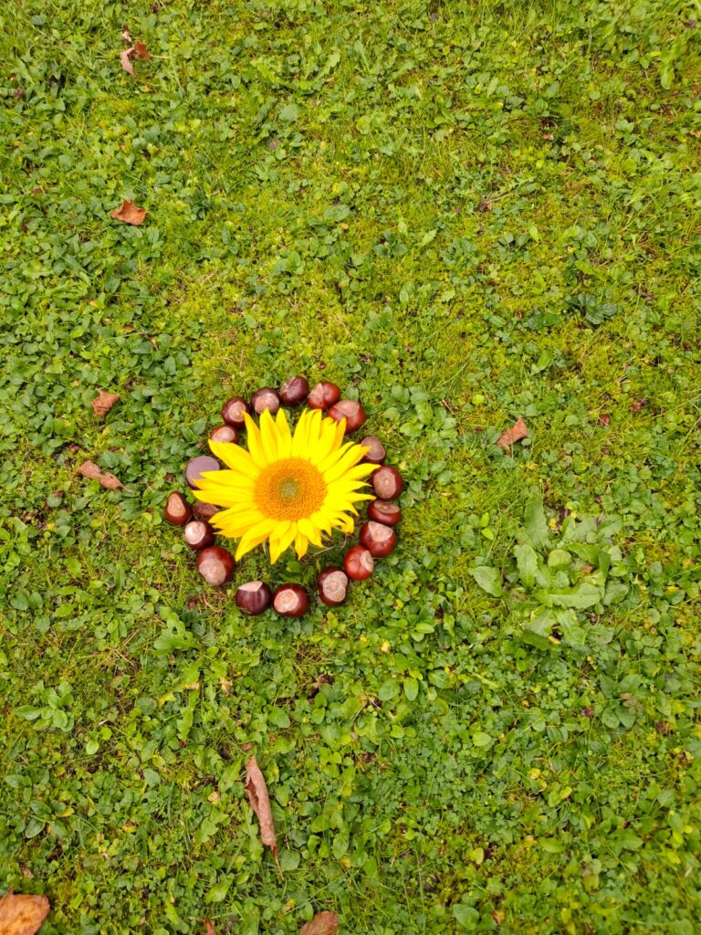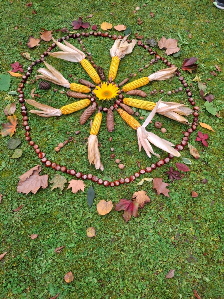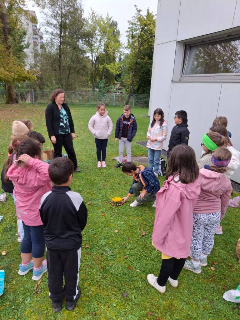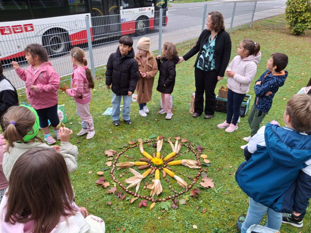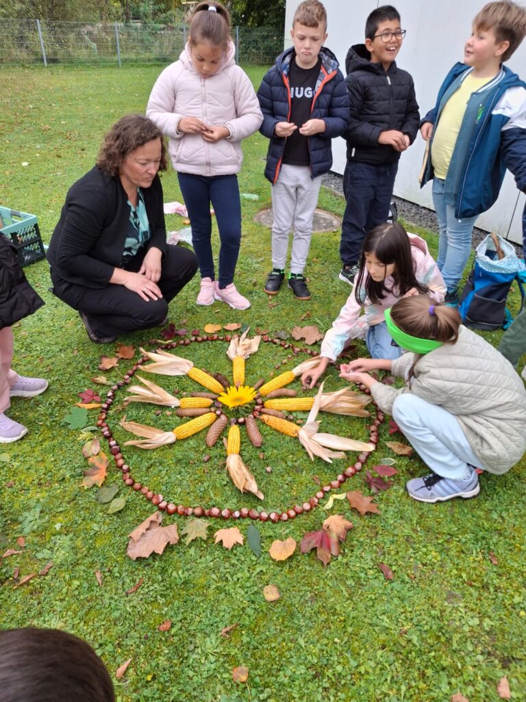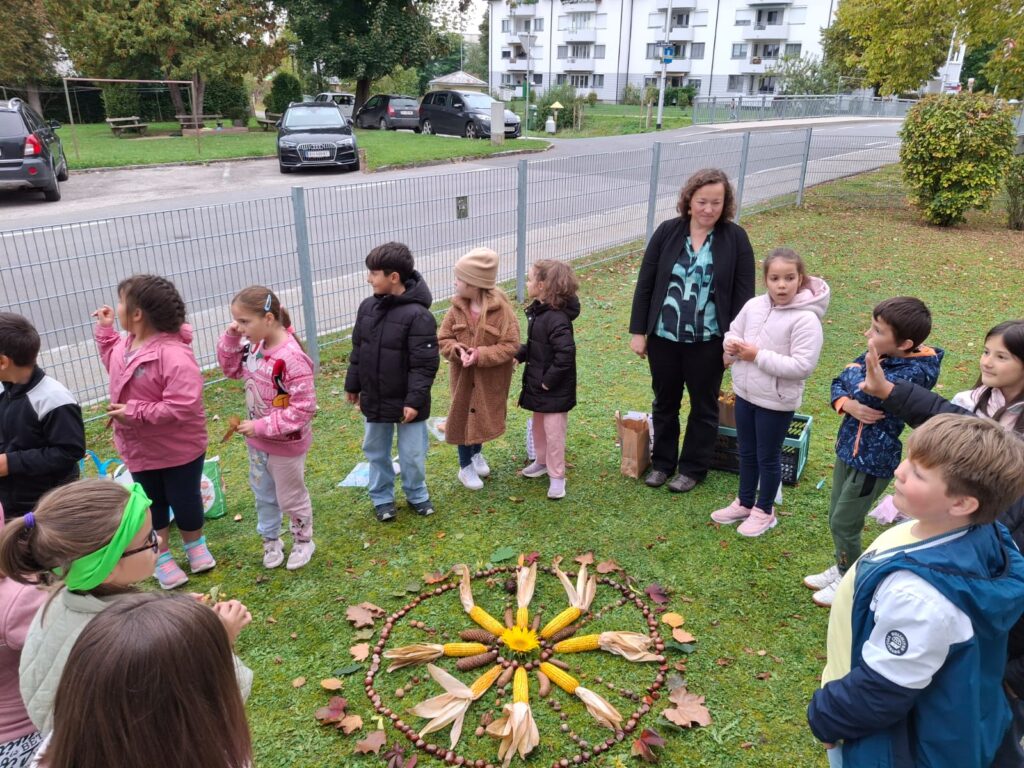 Die Schülerinnen und Schüler der 2a-Klasse begaben sich auf ein fächerübergreifendes Projekt, das Kreativität und Naturverbundenheit miteinander verband. Mit großer Begeisterung sammelten sie in der Umgebung die unterschiedlichsten Naturmaterialien – bunte Blätter, Kastanien, Zapfen, Maiskolben und kleine Nüsse. Anschließend betrachteten sie ihre Fundstücke aufmerksam, staunten über Formen, Farben und Strukturen und ließen ihrer Fantasie freien Lauf. Schritt für Schritt entstand so im Schulgarten ein kunstvolles Mandala, das nicht nur die Vielfalt der Natur widerspiegelt, sondern auch die gemeinsame Arbeit und den Ideenreichtum der Kinder sichtbar macht.