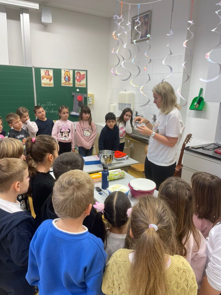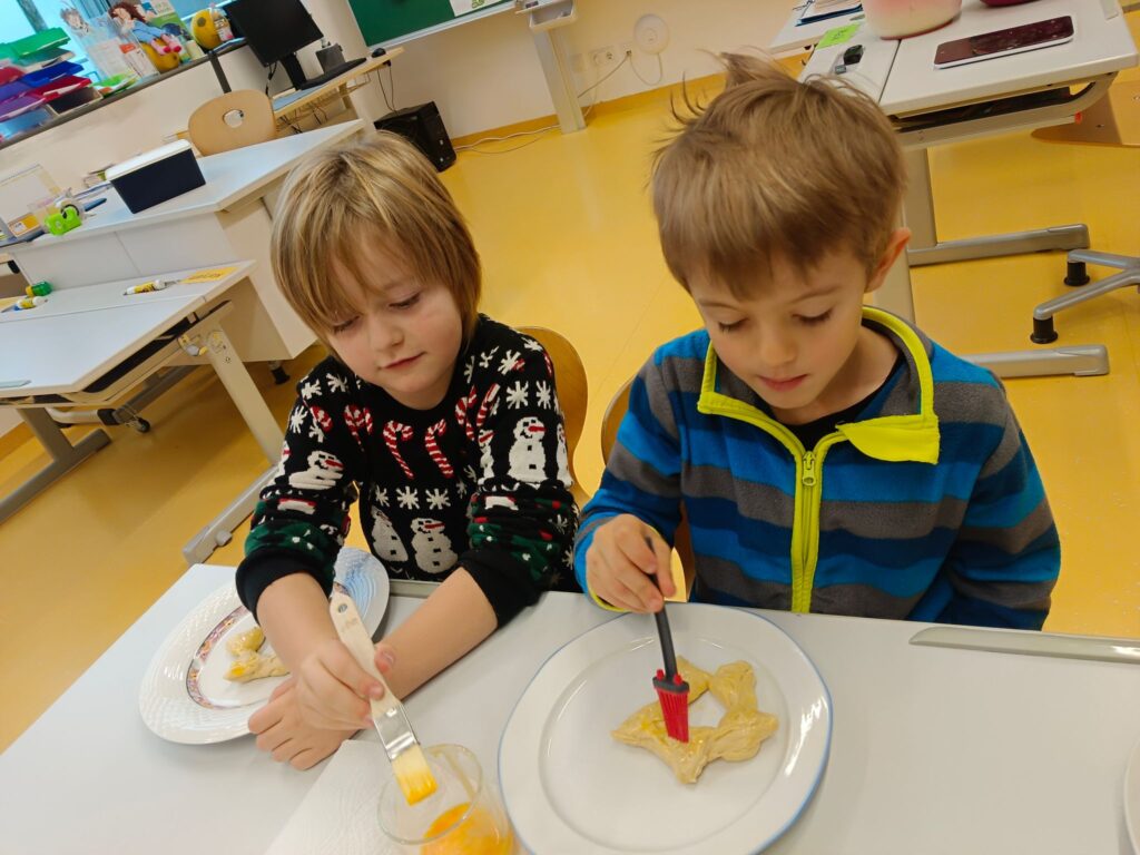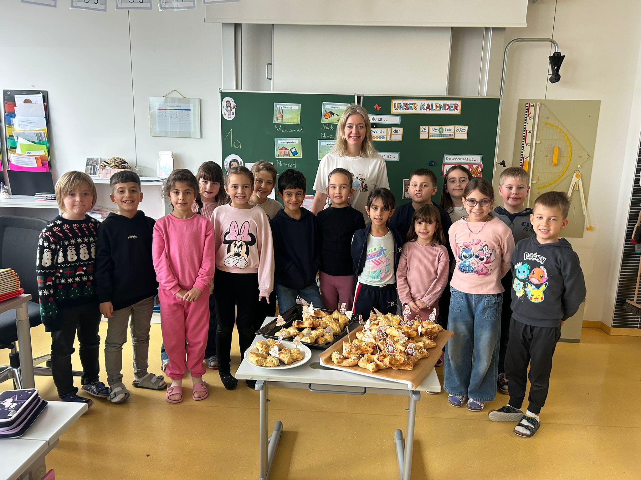 Heute besuchte uns die Mutter von Jakob aus der 1b, Frau Sageder-Ziegler, und verwandelte gemeinsam mit den Kindern der beiden ersten Klassen sowie der Deutschförderklasse die Schule in eine kleine Weihnachtsbäckerei. Mit viel Freude und Eifer bereiteten die Kinder zunächst gemeinsam den Germteig zu. Anschließend formten und backten sie in Kleingruppen ihre eigenen, duftenden Weihnachtssterne.