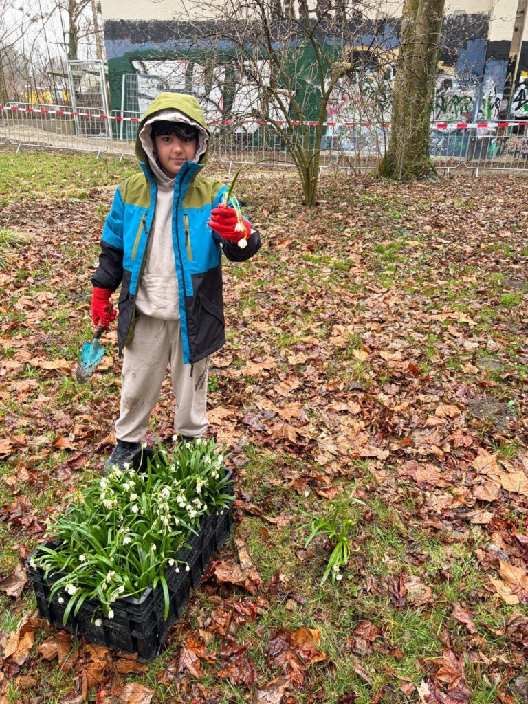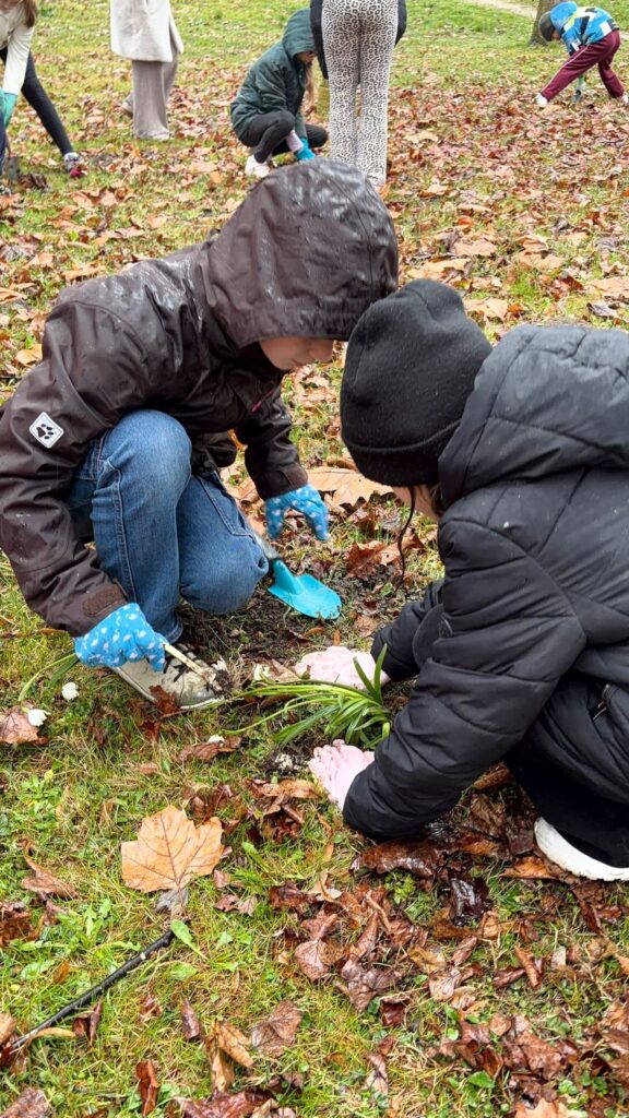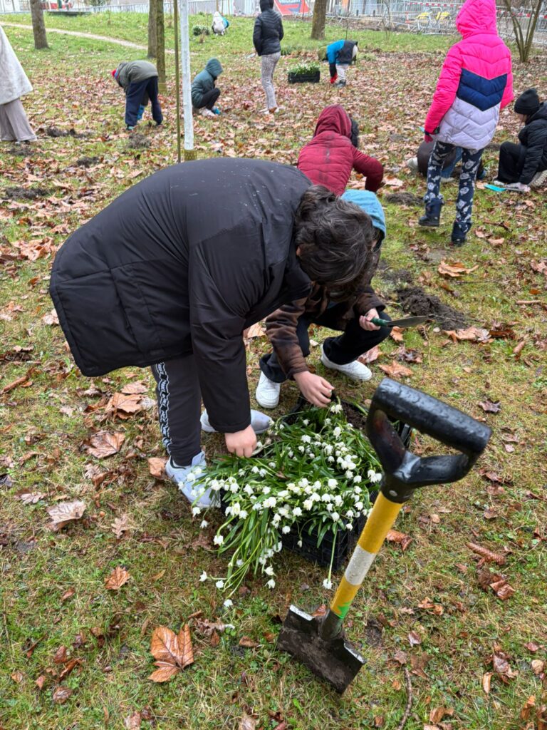 Auch das Wetter konnte die gute Stimmung nicht trüben: Trotz des Regens arbeiteten die Schülerinnen und Schüler mit großem Eifer. Mit Regenjacken und guter Laune ausgestattet, verwandelten sie den Park Schritt für Schritt in ein noch bunteres Blumenmeer.